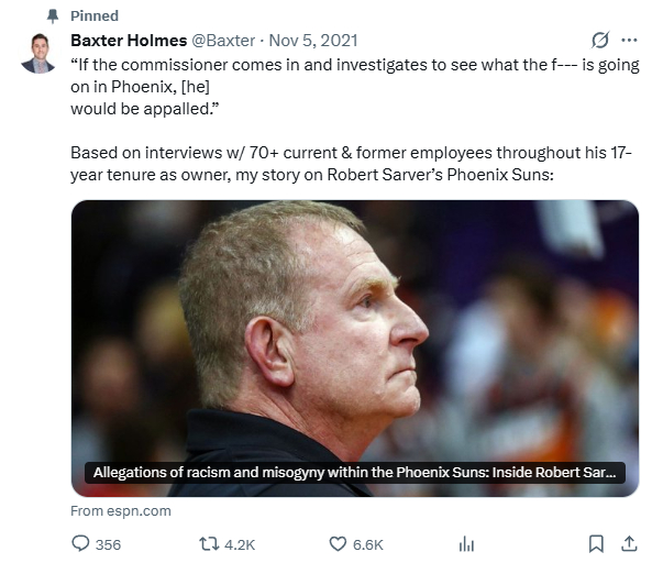 顺带多说一句,操作手法与当初联盟逼太阳前任老板罗伯特-萨弗尔卖队基本一致。先把你黑料扒出来,然后制造舆论风暴,最迫使你乖乖滚蛋。巧了不是?那篇让萨弗尔身败名裂的报道同样是巴克斯特-霍姆斯执笔操刀,至今还在他的个人账号上置顶呢。